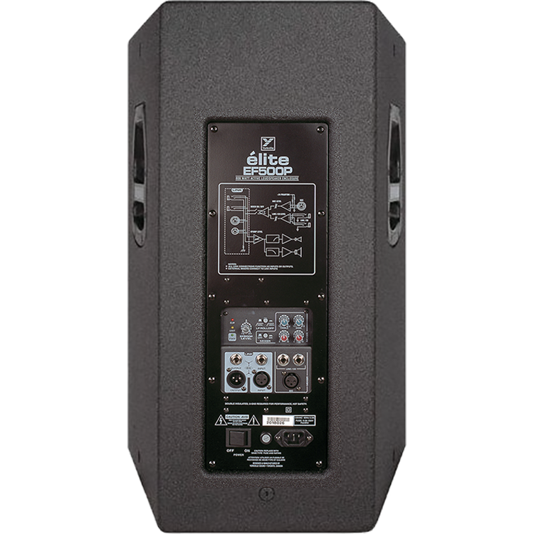 The EF500P redefines performance in a high-power professional active loudspeaker enclosure. Utilizing the popular élite EF508 as a base, and adding a total of 800 watts of bi-amped power and advanced signal processing, the EF500P is destined to set a new standard for active loudspeaker design. The woofer or low frequency amplifier uses Class D switching technology to reduce overall weight of the amplifier section. This amp delivers over 650 watts to the 15″ woofer. A 150 watt two-tier linear technology class H amplifier drives the 2″ titanium diaphragm horn driver. This solution allows the horn to produce loud clean transients to keep up with the high output of the woofer. The two-tier amplifier technology isn’t typically seen in a product like this, however we found the advantages (lower weight, more efficiency, higher headroom and lower operating temperature) made it a perfect choice for powering the top end.