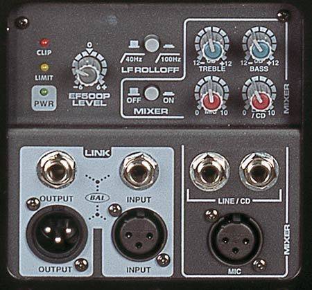 The EF500P has a built in mixer allows the loudspeaker to be used directly with a microphone and / or line source. The loop output allows additional active cabinets to be driven from one cabinet’s mixer stage, or a series of cabinets to be driven from one source. If desired, the end user can combine a pair of the EF500P’s using the mixer inputs on each cabinet and coupling the loop outputs. In this simple example you would have the ideal presentation system with two microphone inputs, two line inputs optimized for CD, Cassette or laptop computer audio source, complete within two speaker cabinets. Many of our active cabinets can be linked together but a maximum of three ‚mixers‘ can be active at any one time. (Making three mic sources and six line sources available in any three or more cabinet array). The microphone input has equalization and high pass filtering appropriate for vocal applications. The trim control allows looped cabinets to be individually adjusted in level. This is invaluable in applications where large numbers of cabinets are used such as clusters or in trade show applications or when EF500P’s are used as repeater cabinets or for side fill. The 100 Hz high pass filters allows the EF500P to be used more efficiently with any active subwoofer.